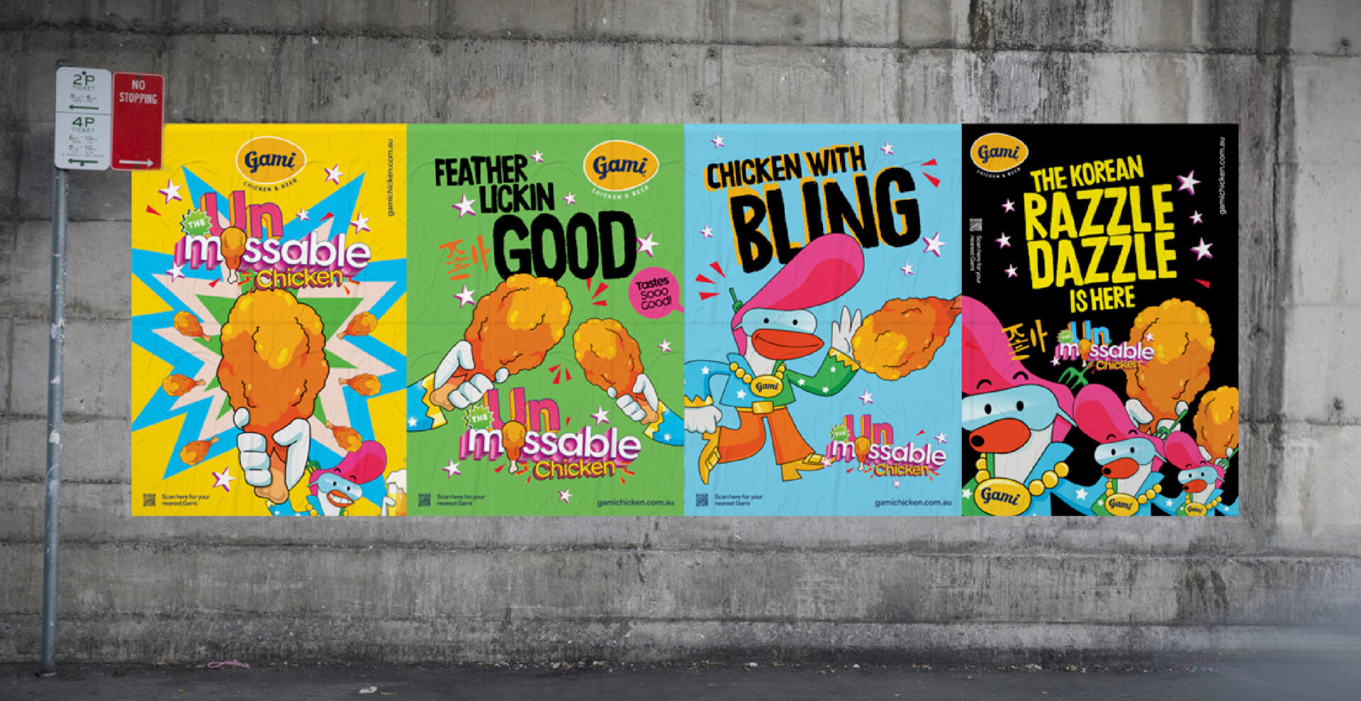 The Idea: The Unmissable Chicken. An embodiment and personification of Gami's brilliant recipe, as well as the culture that brings the razzle dazzle from Korea to mouths nation wide. K-Pop is an analogy of what Australian taste buds experience when they try Gami Chicken, so this was the perfect cultral space to unlock and Korea's Hanguk Anie animae and K-Pop Elvis cheeky persona enabled a visual style that amplified this taste into sight and sound.
